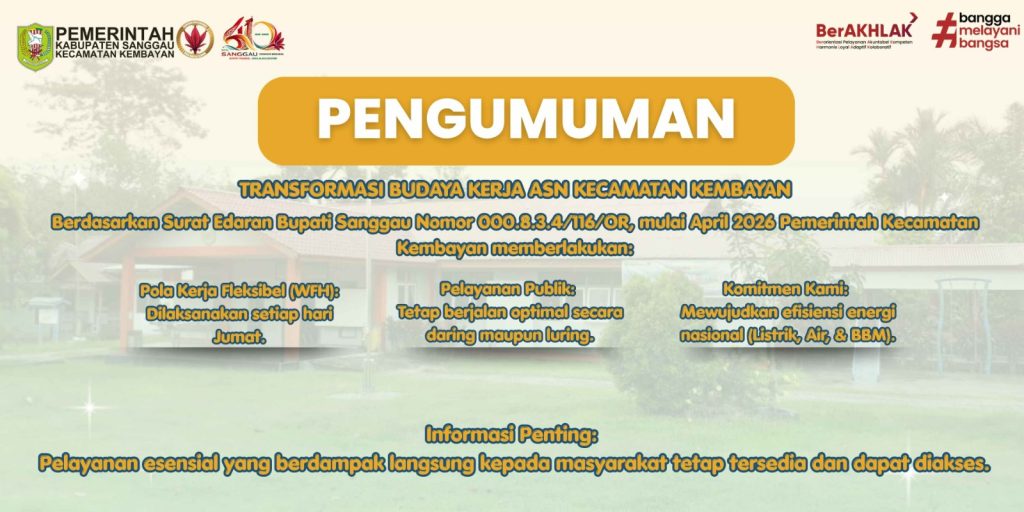 Halo warga Kembayan! Sesuai dengan arahan Bapak Bupati Sanggau melalui SE Nomor 000.8.3.4/116/OR , Kantor Camat Kembayan kini memulai transformasi budaya kerja baru.